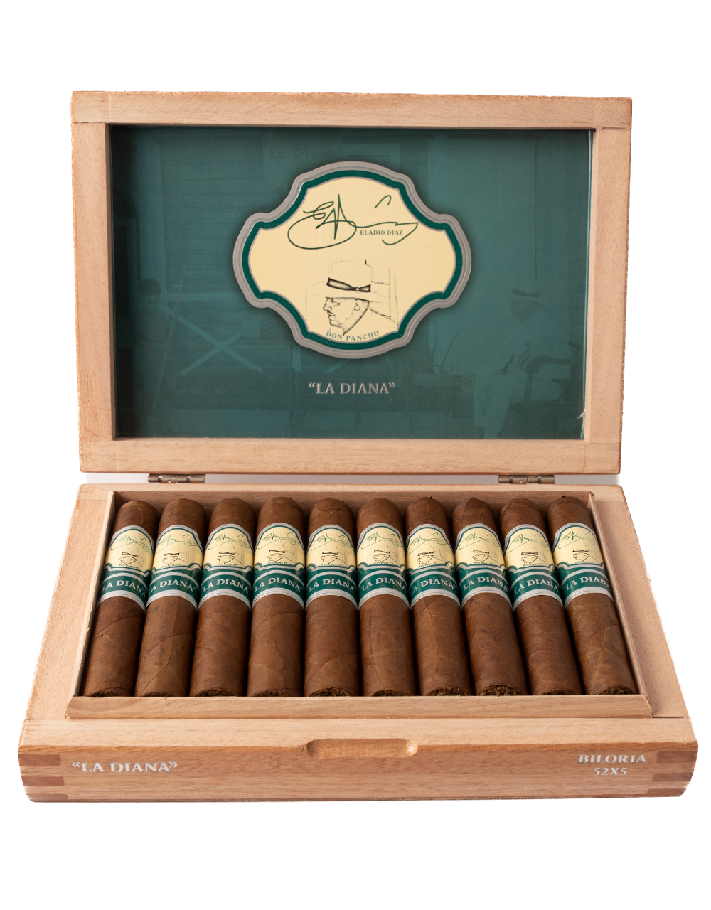The Eladio Diaz “La Diana” Biloria is a robusto masterpiece celebrating the art of Dominican cigar craftsmanship. Measuring 5 x 52, the Biloria format exemplifies harmony between body, balance, and complexity. It is the flagship vitola of the La Diana line—an opulent collection created to honor Eladio Diaz’s 70th birthday, a tribute to his unparalleled legacy in the cigar world.